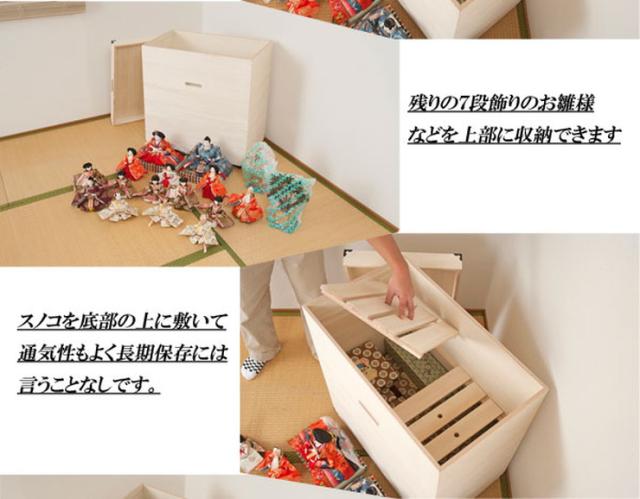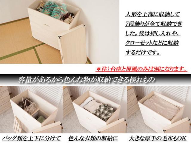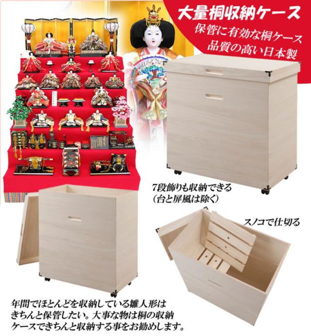 ■商品について/年間でほとんどを収納している雛人形はきちんと保管したい、大事な物は桐の収納ケースできちんと収納したいを可能にした深型桐収納ケースが新登場!雛人形7段飾りも収納できる(台と屏風は除く)大容量の収納力で色んな物の長期保管に最適。たっぷり入る深さ75cmの大容量で布団や衣類などの保管にも。天板は通常の桐箱とは違う4mm厚のフラット天板で高級感があります。持ち易い、くり込みの取っ手も天然木ならでは。隅に飾り金具を手打ちして豪華仕様に加え、キャスター付で移動も楽々、近くに持ってきて雛人形を飾りつけできます。量が入るから色んな物が収納でき、取外し可能なスノコでバッグ類を上下に分けたり、衣類・布団等かさばる物の収納にGood。