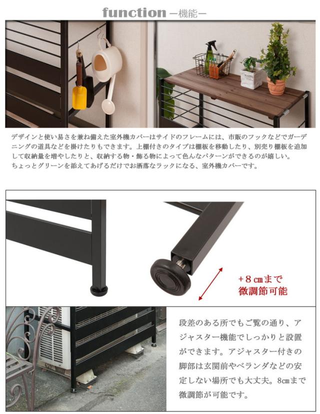 ■商品について/天板や棚板には古木調の天然木を使用し、フレームをスチールで仕上げた異素材の組み合わせがGood。棚部は取り外し可能式で、天然木ゆえの自然環境による劣化でも別売りの棚に買い替えすることで長く使えます。ガーデニング用品の収納やグリーンを飾るなど便利な上棚付きタイプとシンプルロータイプの展開。是非、野暮ったい室外機をすっきりお洒落に目隠ししましょう。