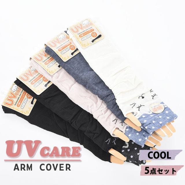 アームカバー アームウォーマー 指穴付き 内側メッシュ UVケア 左右1対 5点セット 全10枚組 レディース ネコ柄 猫柄 紫