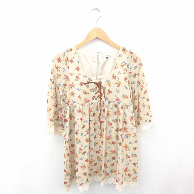 【中古】マーキュリーデュオ ワンピース ひざ丈 花柄 プルオーバー レース 薄手 七分袖 F 薄茶 赤 ベージュ レッド