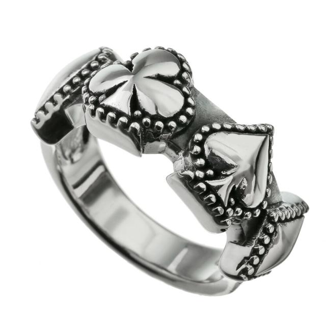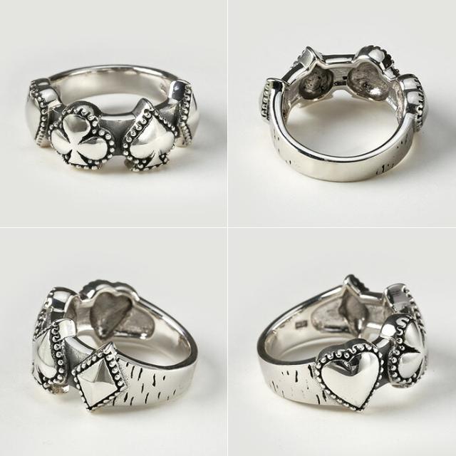 トランプのスペード、ダイヤ、ハート、クラブが並んだデザインのリング。サイドには木の表面を思わせる彫金が施されています。ぷっくりと丸みがあるトランプマークは、ボリューミーで存在感抜群。中抜きを施しているので程良い重量感でインパクトのあるデザインを楽しめます。