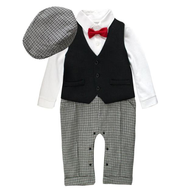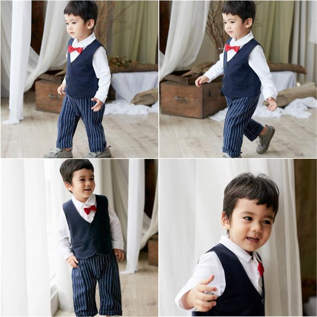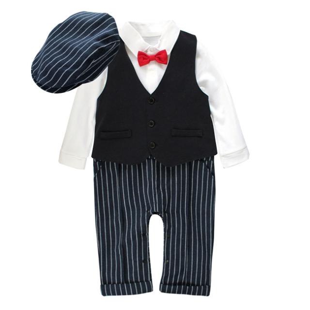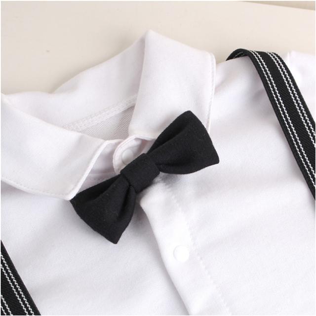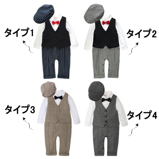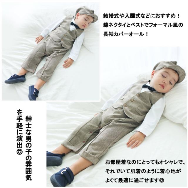 結婚式や入園式などにおすすめ!蝶ネクタイとベストでフォーマル風の正統派の長袖カバーオール!