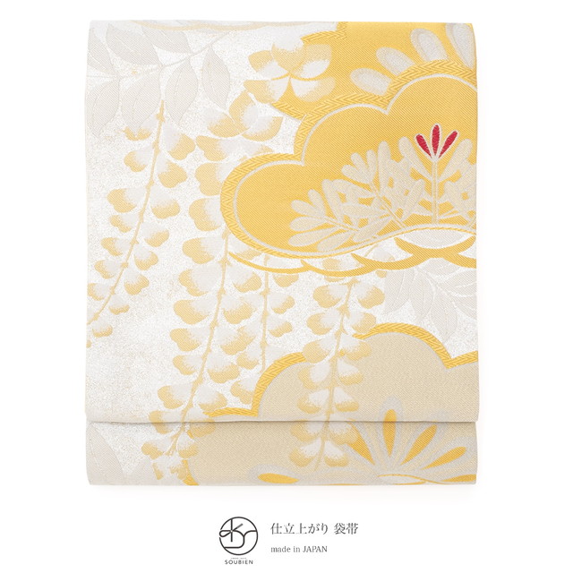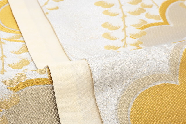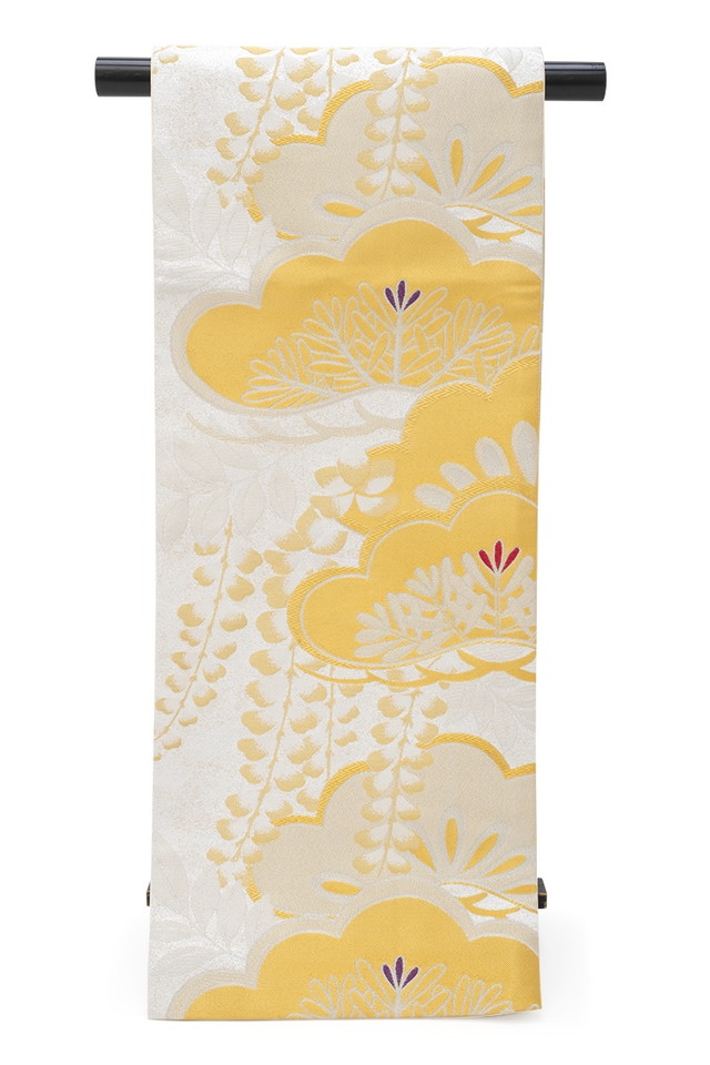 金色や銀色に輝く糸で藤の花や松葉を織り込んだ華やかなデザインです。