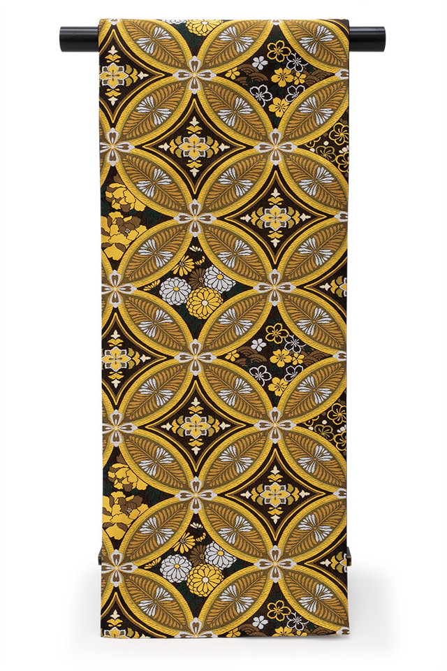 金糸で輝く七宝繋ぎに菊や桜、牡丹などを織り込んだ華やかなデザインです。