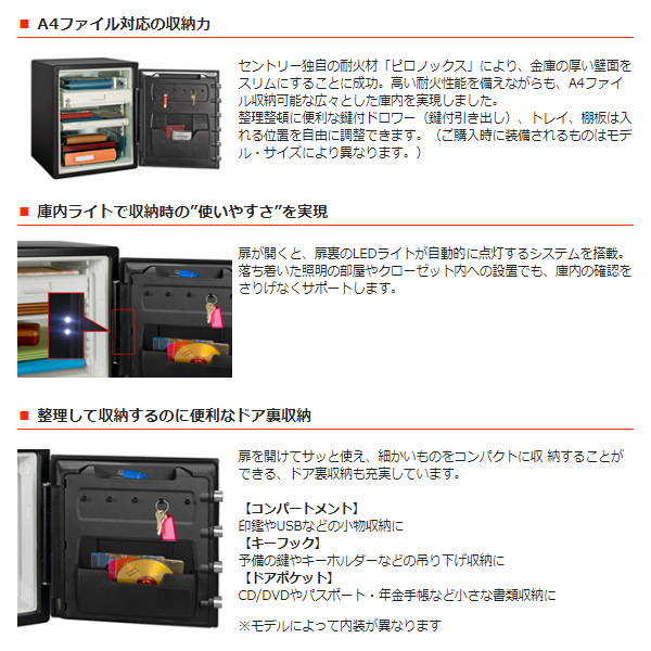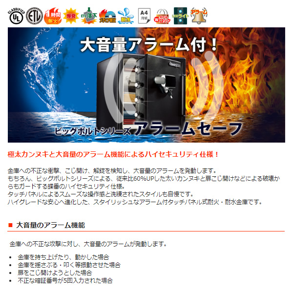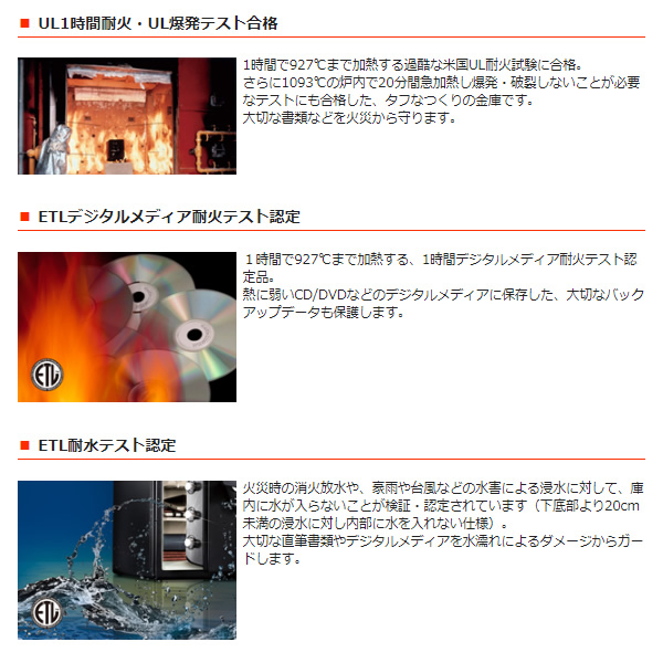 | 性能 | UL1時間耐火テスト合格 ETL耐水性能テスト認定 UL爆発テスト合格 ETL落下衝撃テスト認定 ETLデジタルメディア耐火テスト認定 A4サイズ収納可能 |