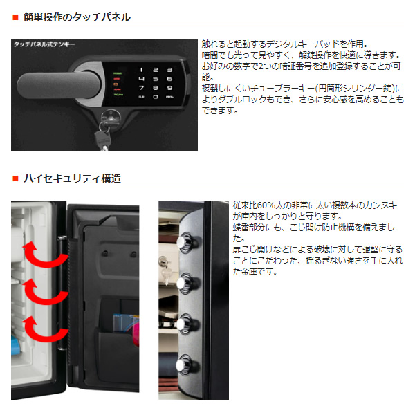 極太カンヌキと大音量のアラーム機能によるハイセキュリティ仕様! 金庫への不正な衝撃、こじ開け、解錠を検知し、大音量のアラームを発動します。 ■外寸サイズ(幅×奥×高):約415mm×約491mm×約348mm ■内寸サイズ(幅×奥×高):約310mm×約280mm×約244mm ■質量:約32kg ■容量:約22.8リットル ■ロックタイプ:タッチパネル+チューブラーキー ■性能: UL1時間耐火テスト合格 ETL耐水性能テスト認定 UL爆発テスト合格 ETL落下衝撃テスト認定 ETLデジタルメディア耐火テスト認定 A4サイズ収納可能 ■付属品:鍵2本、棚板1枚、鍵付きドロワー1個(ドロワー用鍵2本付)、取扱説明書・保証書、単4乾電池4本(モニター用) ※記載は商品仕様の一部です。仕様説明不足等の理由での返品はできません。特に適合等は必ずご確認ください。