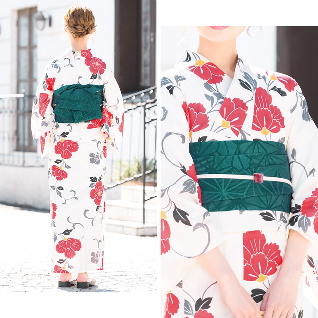 帯は、体に巻いて後ろで結ぶタイプの半幅帯、または作り帯からお選びいただけます。モデル着用は半幅帯です。