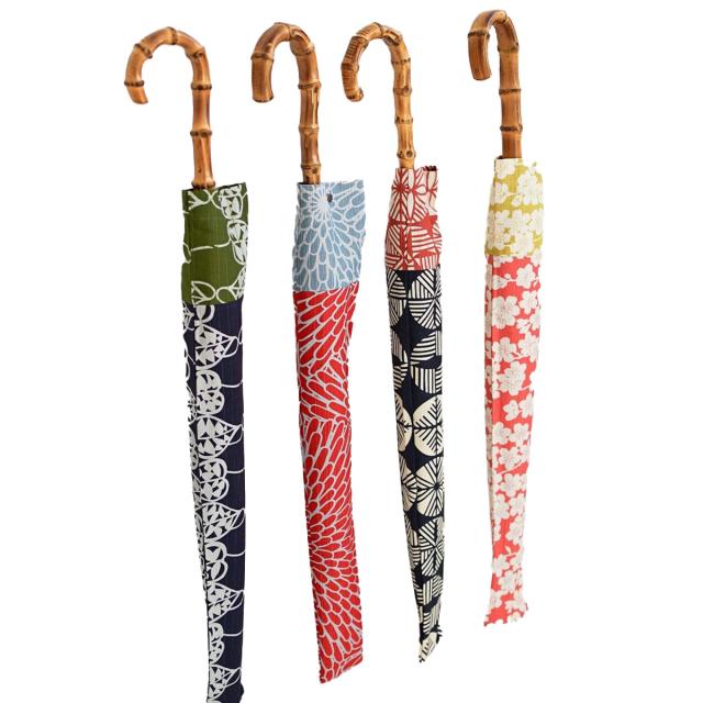 【インパクトのある和柄は外国の方への贈り物にもぴったりです】古くから日本に伝わる染織技法の一つ「型絵染(かたえぞめ)」を使いながらも、斬新かつ繊細な文様を表現した伊砂文様(いさもんよう)デザインの生地でつくられた『伊砂文様 晴雨兼用長傘』をお届けします。 昭和5年に創業した日本橋の傘専門店 小宮商店は、日本の洋傘の伝統を大切にし、職人による日本製の傘をつくり続けてきました。生地の裁断から傘に張り付けるまで、熟練の傘職人が一本一本手づくりで丁寧に仕上げています。『伊砂文様 晴雨兼用長傘』は、天然木(カエデ)素材の中棒を使用し、風呂敷として販売されている生地に防水・防撥水、UVカット加工を施した、雨傘としても日傘としてもお使いいただける晴雨兼用傘です。カラーは「松」「菊」「しだれ桜」「ハートカズラ」の4種類の模様でご用意しました。 ロクロ包み、ダボ包みといった昔ながらの技法を使った美しいデザイン。持ちやすく使い勝手もよいので、女性への贈り物にも喜ばれるお品です。