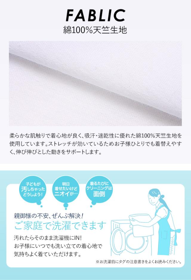 ・柔らかな肌触りで着心地が良く、吸汗・速乾性に優れた綿100%天竺生地を使用しています。ストレッチが効いているためお子様ひとりでも着替えやすく、伸び伸びとした動きをサポートします。