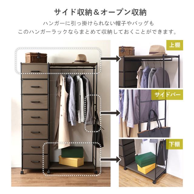 | コートなど衣類や帽子、小物類も美しく収納できるハンガーラック 引き出し7杯付きワイドタイプ 商品サイズ(外寸):(約)幅105×奥行35.5×高さ155cm 内寸及び補足説明:■組立式■引出内寸:約幅35×奥行33×深さ18cm■キャスター4個付(内2個ストッハ゜ー付)■S字フック5ヶ付 成分・材質:フレーム:スチールパイプ,張地:ポリエステル |
