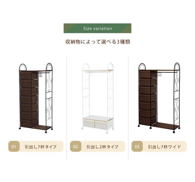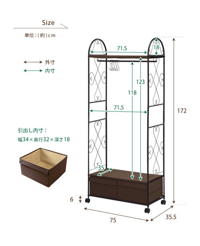 | アイアンの曲線がエレガント、衣類や帽子・小物類も美しく収納できるハンガーラック 商品サイズ(外寸):(約)幅75×奥行35.5×高さ172cm 内寸及び補足説明:■S字フック5ヶ付 ■キャスター付 ■組立式 ■引出内寸:約幅34×奥行32×深さ18cm 成分・材質:主材:スチール |