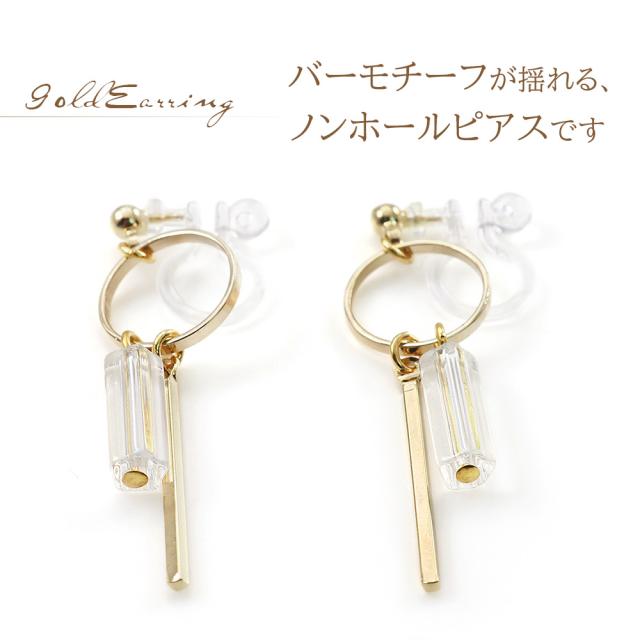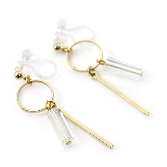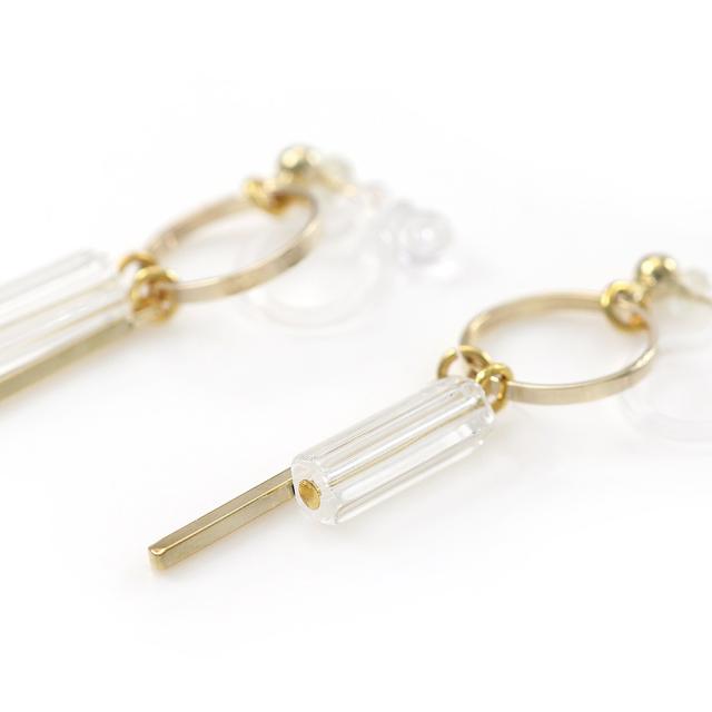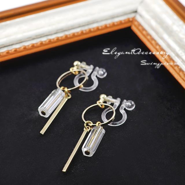 クリアビーズとゴールドバーが揺れる、樹脂イヤリングです!