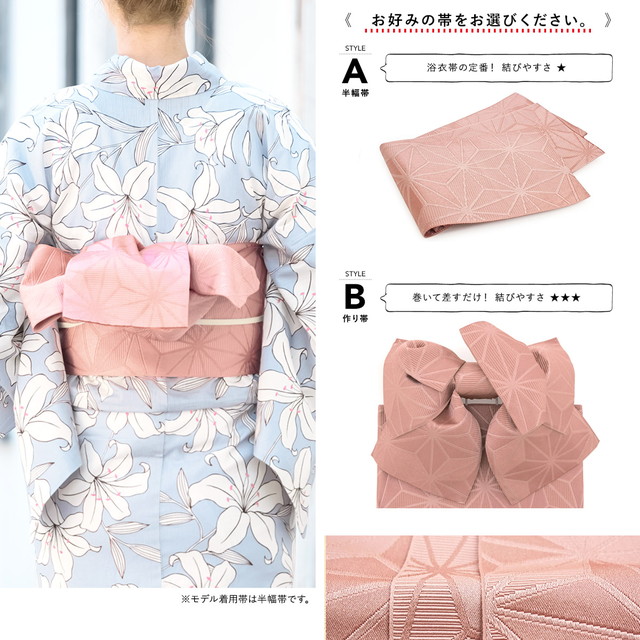 帯は体に巻いて後ろで結ぶタイプの半幅帯、または作り帯からお選びください。モデル着用は半幅帯です。