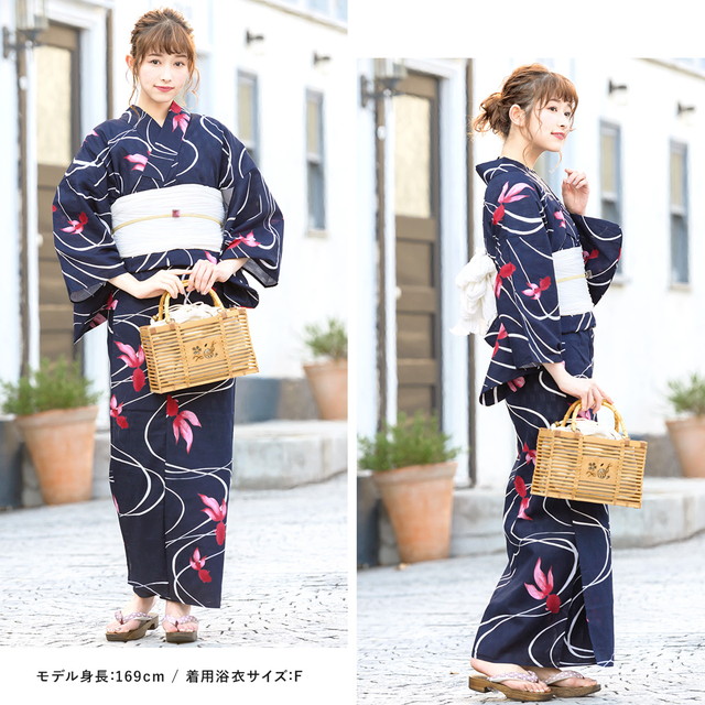 浴衣セット レディース 浴衣セット 兵児帯 大人 2点セット(浴衣/帯) 濃紺 ダークネイビー 白 金魚 流水紋 綿 洗える 夏 花火大会 ボヌールセゾン S・フリー