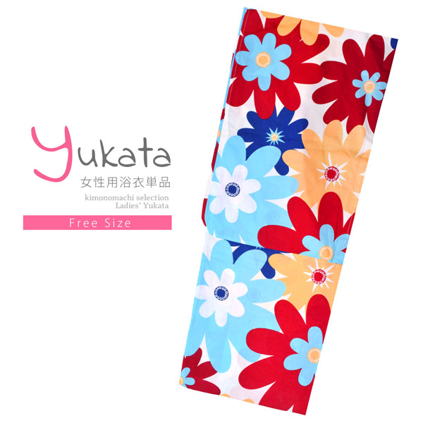 浴衣 レディース 単品「白地 ビッグフラワー、水色」フリーサイズ レトロ モダン 大人柄 女性浴衣単品 女浴衣 ゆかた yukata 【メール便不可】