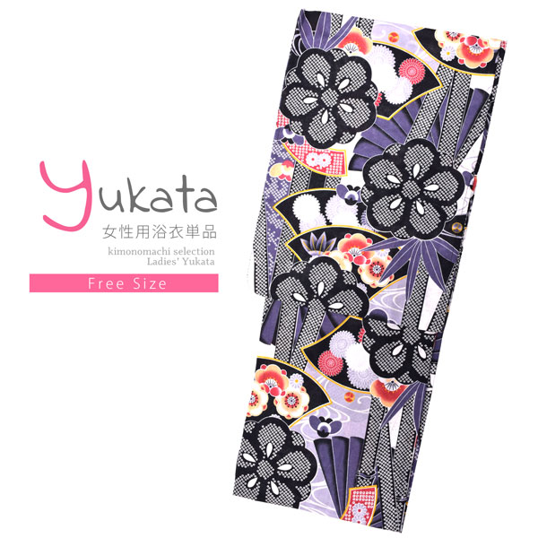浴衣 レディース 単品「黒×グレー 扇に竹、花紋」フリーサイズ レトロ モダン 大人柄 女性浴衣単品 女浴衣 ゆかた yukata 【メール便不可】