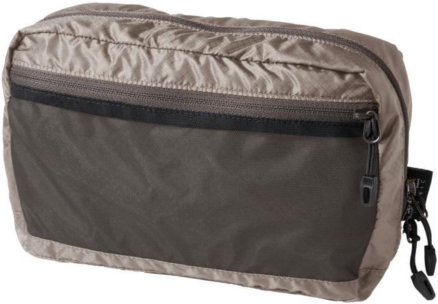 小物の収納に便利な小型ポーチバッグ。フロント部にメッシュポケットを設け、内部にはキーホルダーを備え付けました。開口部は両サイドにカベマチを設け、ファスナーを全開にしても中身がこぼれにくい仕様に。また左右上下の四隅に小さなループを付けているので、キーカラビナ等を使って、バックパックのショルダーハーネスなどに取り付けが可能です。
