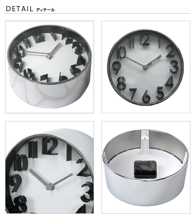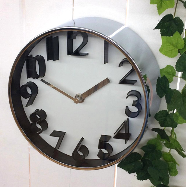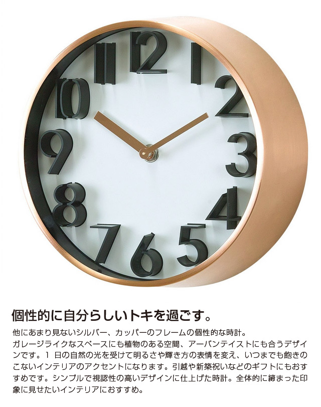 他にあまり見ないシルバー、カッパーのフレームの個性的な時計。ガレージライクなスペースにも植物のある空間、アーバンテイストにも合うデザインです。1日の自然の光を受けて明るさや輝き方の表情を変え、いつまでも飽きのこないインテリアのアクセントになります。引越や新築祝いなどのギフトにもおすすめです。シンプルで視認性の高いデザインに仕上げた時計。全体的に締まった印象に見せたいインテリアにおすすめ。