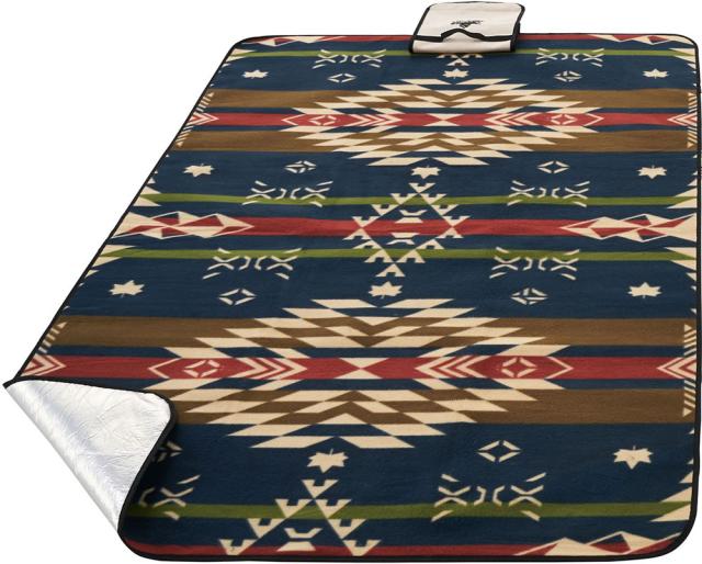 どんな地面でも快適に過ごせる!断熱防水ピクニックサーモマット。ネイティブ柄デザインが個性的なサーモマット。アルミ仕上げにより熱や冷気をやわらげる断熱効果があり、湿った地面や濡れた芝生の上でも安心して使える防水仕様もプラス。ピクニックやイベントでの使用はもちろん、テント室内に敷いて使うことも可能。