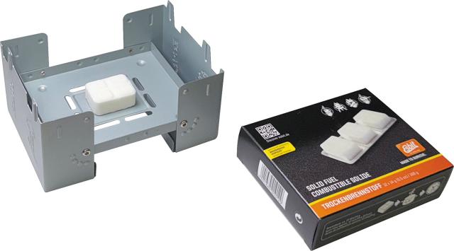 固形燃料を折りたたんだ五徳中に収納しているので簡単にポケットにしまえます。14gタブレット1個でほぼ600ccのお湯が沸かせます。ドイツ軍、オーストリア軍、フランス軍の標準装備とし採用されており、キャンプ、登山、災害時のサイバイバル用品として最適です。