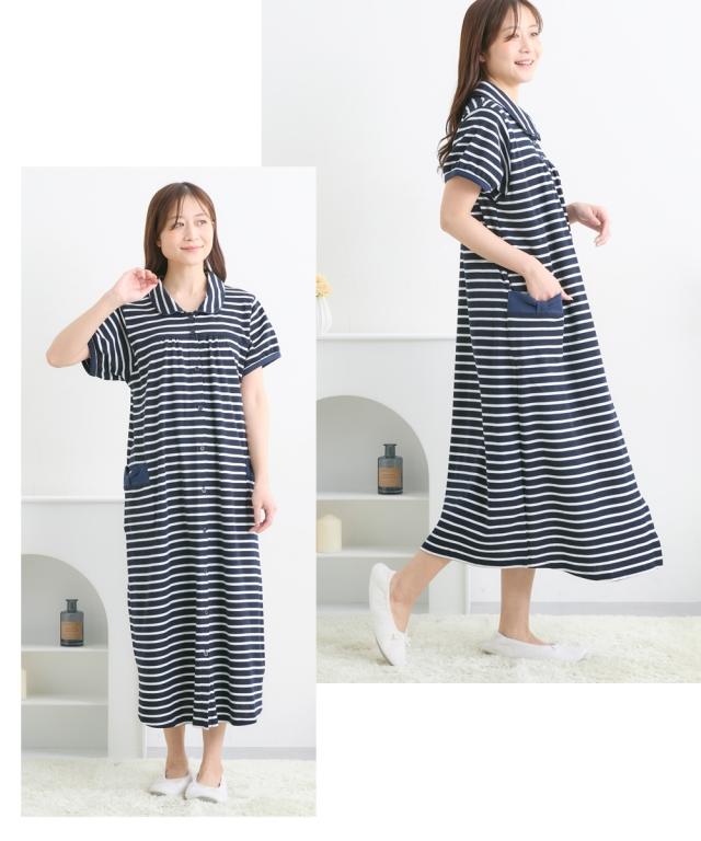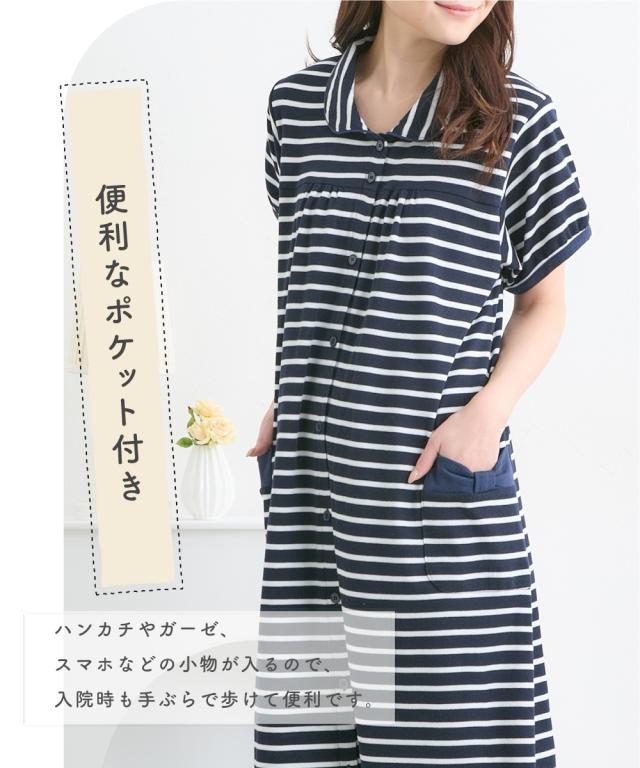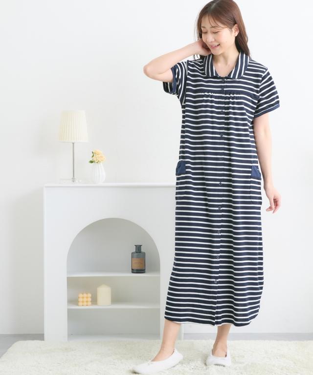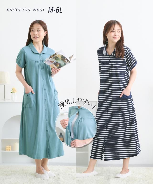 パジャマ マタニティ ママ 産前 産後 授乳服 スムースボーダー柄 前開き ネグリジェ M/L