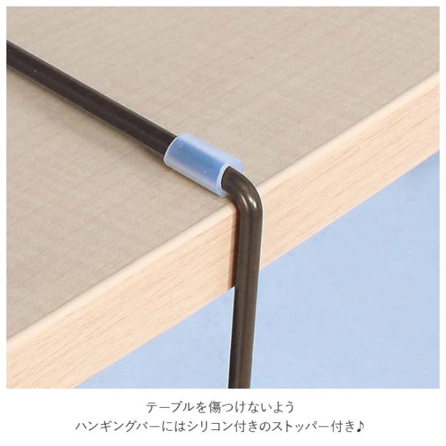 | 使用方法 | 1.ハンギングバーを本体上部の通し穴に、ポケット側から反対側へ、突起部が出るまで差し込みます。 2.ハンギングバーを天板に引っ掛けます。この時、ハンギングバーの手前のL字部が、天板のフチに当たるまでしっかりと差し込んでください。最後に奥にU字部と天板のフチ部分にすべり止めを移動させてください。 |