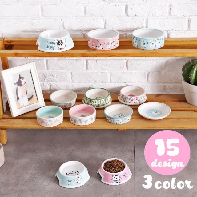 ペット用食器 セラミック 陶器 犬用 猫用 ペット用品 フードボール エサ皿 餌入れ 円形 イラスト ロゴ 可愛い ピンク グリ
