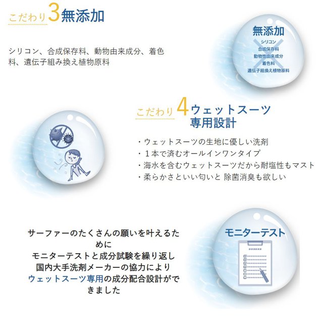 | 主な仕様 | 洗剤と柔軟剤の機能をこの1本にまとめました。ウェットスーツ専用に設計開発した、全く新しいタイプの洗浄柔軟剤。 |