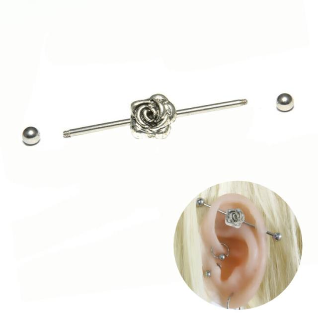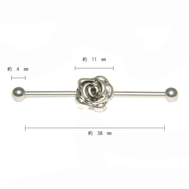 【メール便対応】ボディピアス ロングストレートバーベル -3 ローズ バラ モチーフ 14G (1.6mm) シャフト38mm×ボール4mm ジュエル サージカルステンレス316L【軟骨 インダストリアル スタンダード】┃