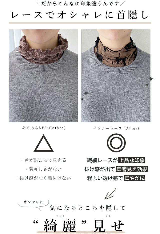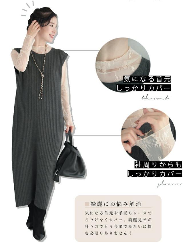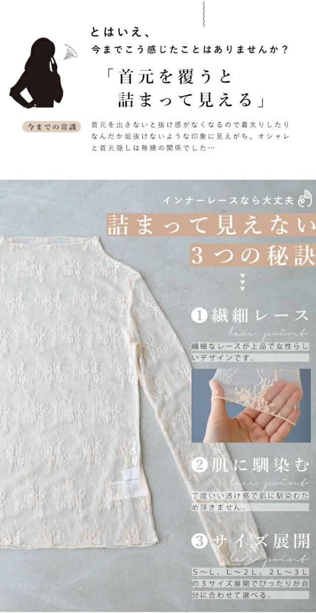 再入荷9月4日 首元のシワをオシャレに隠せる インナーレース w50700 cawaii レース トップス 透け感 ロングTシャツ 長袖 薄手 シアーシャツ 涼しい レイヤード 花柄 刺繍 オフィス ゆったり 体型カバー ハイネック