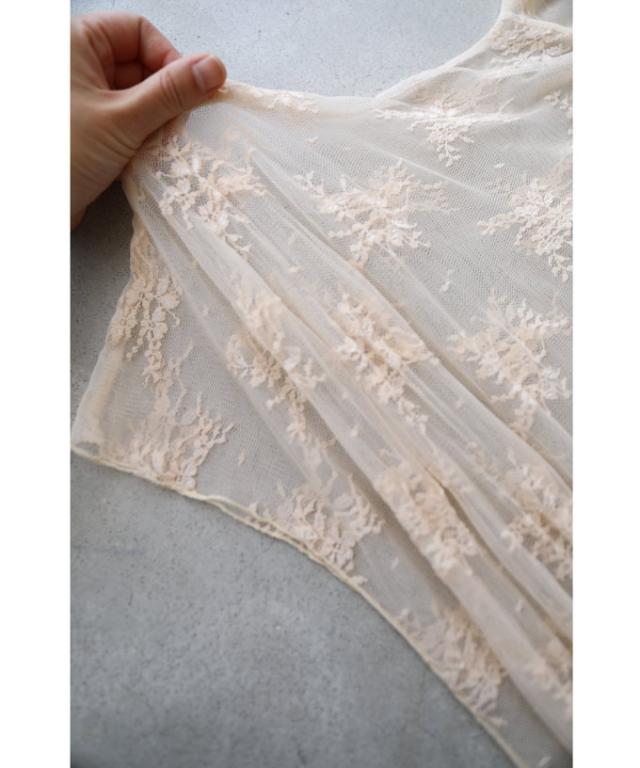 シアー素材のチュ−ルに小花刺繍を施した生地です。全体的に透け感があります。