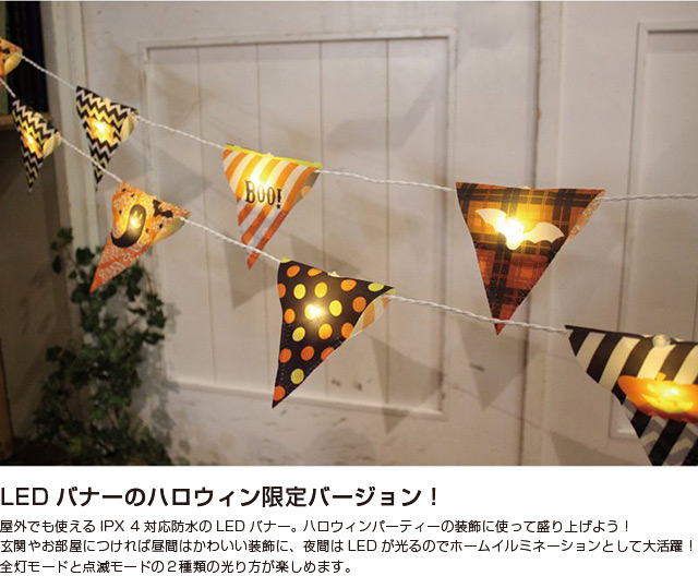屋外でも使えるIPX 4対応防水のLEDバナー。 ハロウィンパーティーの装飾に使って盛り上げよう!玄関やお部屋につければ昼間はかわいい装飾に、夜間はLEDが光るのでホームイルミネーションとして大活躍!全灯モードと点滅モードの2種類の光り方が楽しめます。