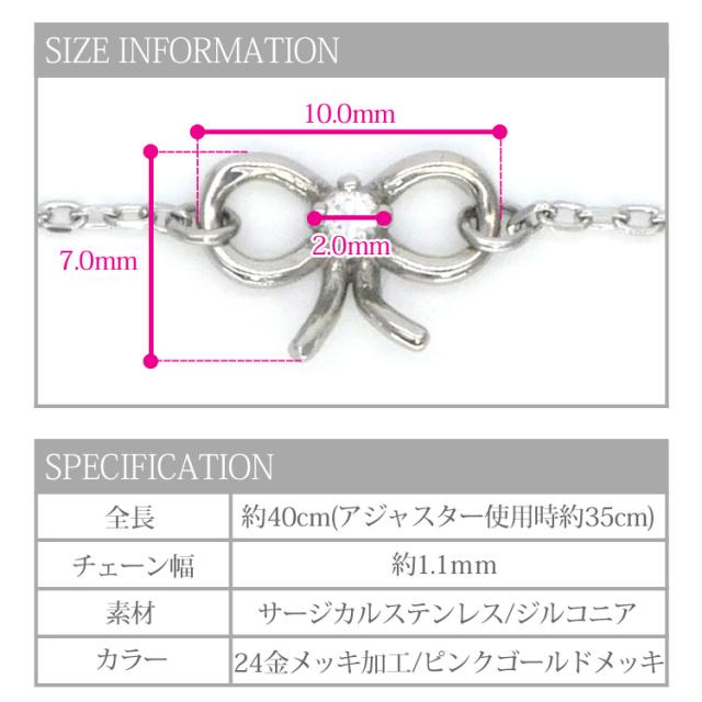 アレルギーフリーで傷が付きにくいプチサイズのステンレスペンダント。大人の女性にぴったりのサイズ感です。女性には欠かせないキラキラジュエルが輝くオシャレなジュエリー。セットされた上品なジルコニアが瞬き煌めき、 つけているだけで心躍るような気持ちにしてくれます。 リボンの中央に1粒のキュービックジルコニアをあしらい、上品かつ可愛らしいデザインに仕上げました。 ネックレスチェーンの長さは40cm。アジャスターが着いているので35cmの長さにして使用することもできます。