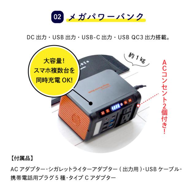 ●セット内容/ソーラーパネル:本体・出力ケーブル・ACコンセント2個付きメガパワーバンク用プラグ・ノートパソコン用プラグ12個・カラビナ2個、メガパワーバンク:本体・ACアダプター・シガレットライターアダプター(出力用)・USBケーブル・携帯電話用プラグ5種・タイプCアダプター