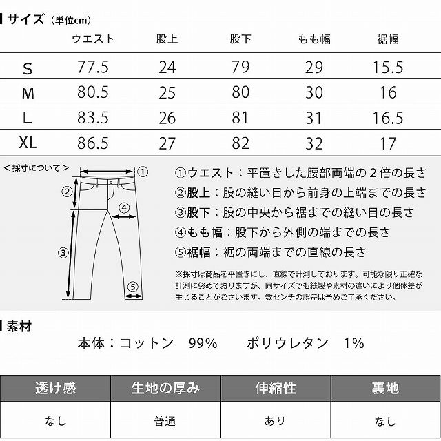 | サイズ | ウエスト | 股上 | 股下 | もも幅 | 裾幅 |