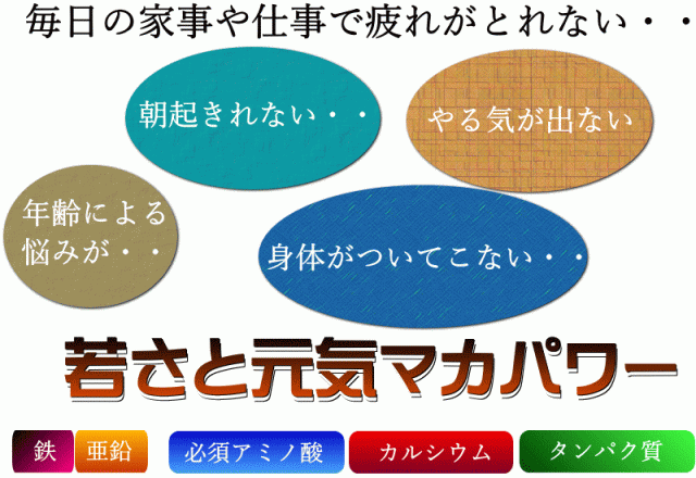 | マカパワーを実感してみませんか? 青森県五所川原市産の安心安全のマカ100%使用。 なかなか疲れがとれない・・・・ 年齢のせいか・・・と思うことが増えてきた。 毎日、元気で若々しくいたい! 男性は元気パワー 女性は体のリズム調整に |