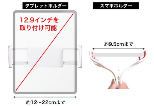 タブレットは幅約220mmまで、スマートフォンは幅約95mmまで取り付ける事ができるので、 12.9インチのタブレットも使用できます。