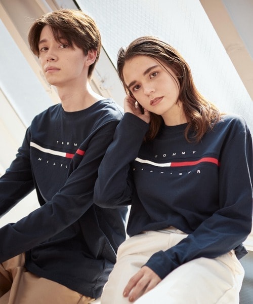 トミーヒルフィガーのブランドロゴであるレッド×ネイビー×ホワイトのフラッグモチーフをラインのように胸元に配したスポーティなロングスリーブTシャツ。