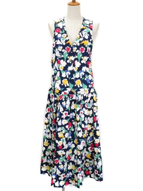【中古】レリアン Leilian セットアップ 花柄 ベスト リボン スカート フレア 9 紺 ネイビー レディース