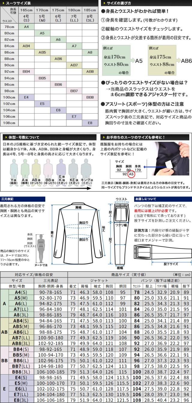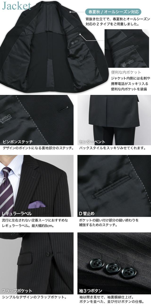 | ▼ジャケット ・2ツボタン ・切り台場仕立て ・見返しピンポイントステッチ ・玉縁ポケット ・D管止め ・袖額縁仕立て ・袖3ツボタン ・センターベント ・背抜き仕立て (春夏秋/オールシーズン対応の2タイプ) ▼スラックス ・ワンタック(±6cmウエスト調節アジャスター付き) ・持ち出し、前カン、天狗 ・膝裏当て ・上下とも洗濯機で洗えるウォッシャブルタイプ |