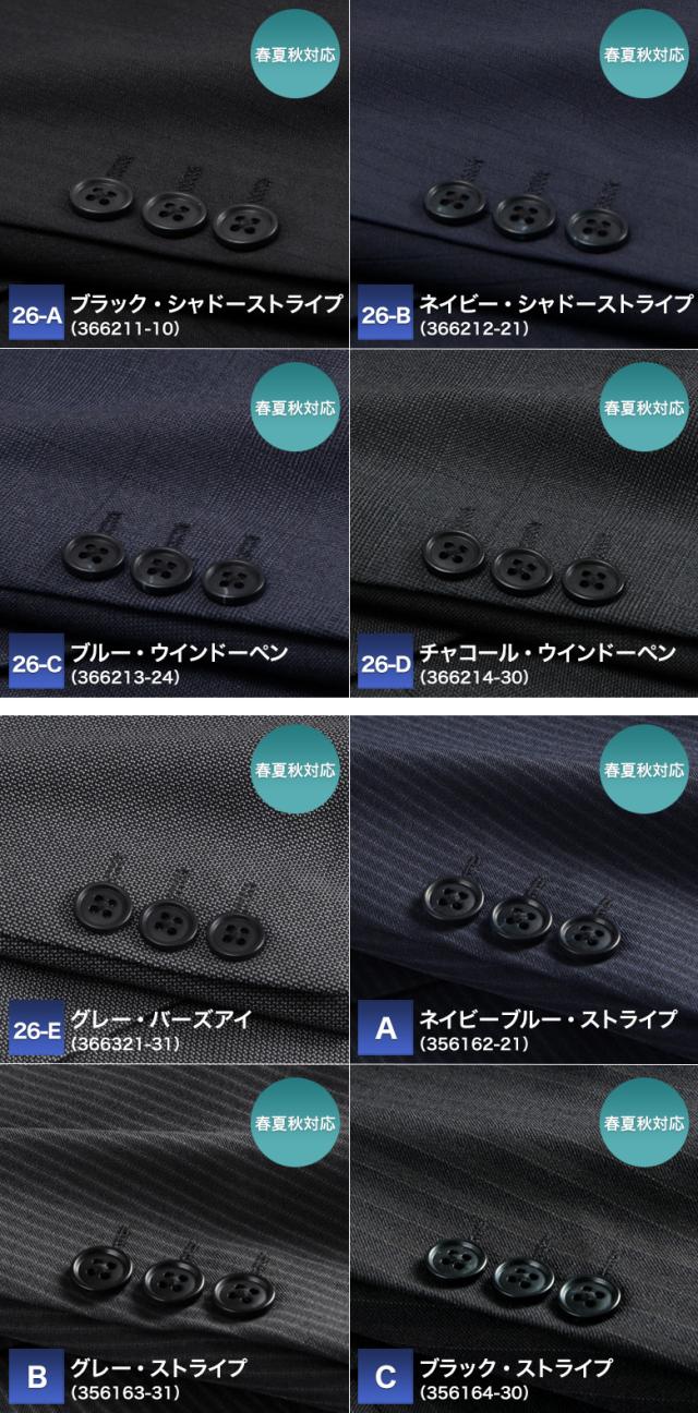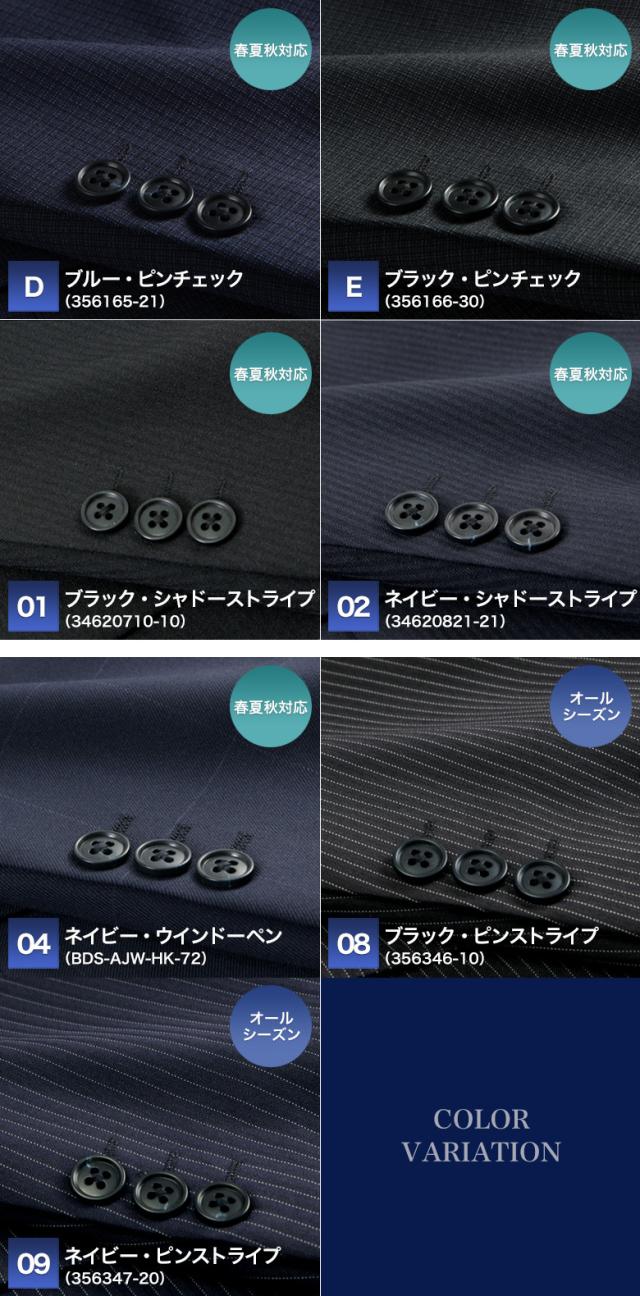 | ▼春夏秋対応 【26-A】ブラック・シャドーストライプ(366211-10) 【26-B】ネイビー・シャドーストライプ(366212-21) 【26-C】ブルー・ウインドーペン(366213-24) 【26-D】チャコール・ウインドーペン(366214-30) 【26-E】グレー・バーズアイ(366321-31) 【A】ネイビーブルー・ストライプ(356162-21) 【B】グレー・ストライプ(356163-31) 【C】ブラック・ストライプ(356164-30) 【D】ブルー・ピンチェック(356165-21) 【E】ブラック・ピンチェック(356166-30) 【01】ブラック・シャドーストライプ(34620710-10) 【02】ネイビー・シャドーストライプ(34620821-21) 【04】ネイビー・ウインドーペン(BDS-AJW-HK-72) ▼オールシーズン 【08】ブラック・ピンストライプ(356346-10) 【09】ネイビー・ピンストライプ(356347-20) ※2026年2月より色柄を追加して販売しています |