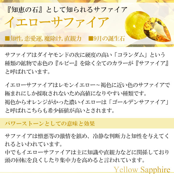 サファイア(青玉)はダイヤモンドの次に硬度の高い「コランダム」という種類の鉱物で、赤色の『ルビー』を除く全てのカラーが『サファイア』と呼ばれています。
