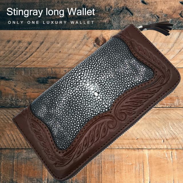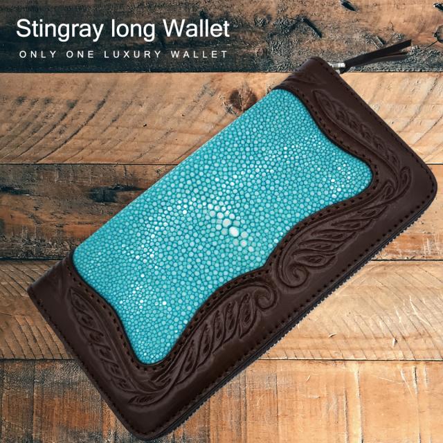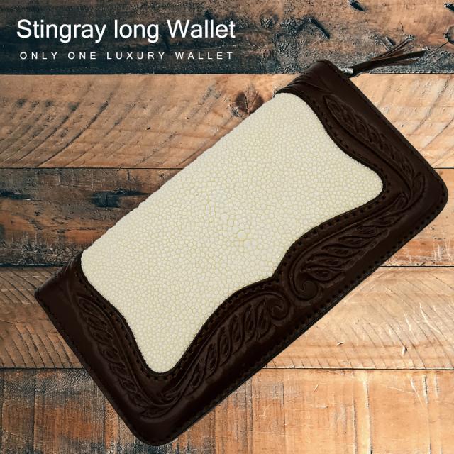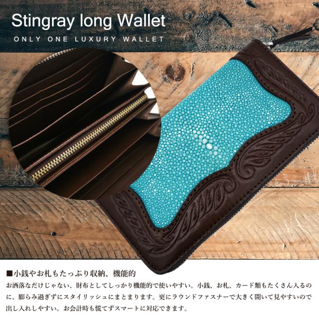 長財布 本革財布 スティングレイ スティングレー カービング レザークラフト バイカーズウォレット メンズ ハンドメイド ギフト