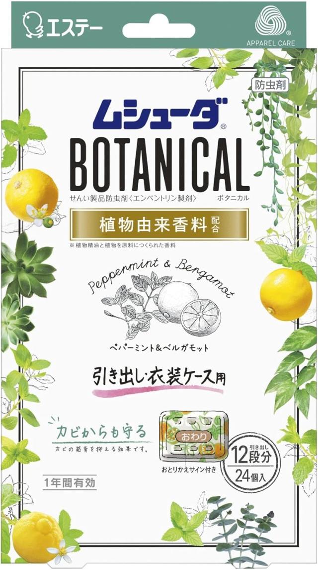 かおりムシューダ ボタニカル 1年間有効 防虫剤 引き出し・衣装ケース用 ペパーミント&ベルガモット 24個入※パッケージデザイン、変更の場合あります。
