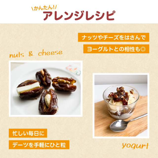 | 特徴・お召し上がり方 | 香料、保存料、着色料、砂糖不使用! アラブの美容食!ナツメヤシの実!イラクやアラブ諸国、西は北アフリカのモロッコまでの広い地域で、 古くから重要な食物となっている。イスラム諸国では、デーツと牛乳は伝統的にラマダーン期間中の日没後に最初に取る食事である。また、長期保存ができ、砂漠のような雨が少ないところでも育つため、デーツは乾燥地帯に住むサハラ砂漠の遊牧民やオアシスに住む人たちにとっても大切な食料となっている。果物としてはカロリーも高いため、主食として主たる炭水化物源食物とすることも容易であり、遊牧生活を送るアラブ人であるベドウィンは、伝統的に乾燥させたデーツと乳製品を主食としている。 ★チュニジアではデーツを小麦粉で包み揚げ、砂糖シロップに漬けて完成となるマクルードがある。また、乾燥させたデーツを粉にして小麦とまぜて保存食にする。 ★ジャムやゼリー、ハルヴァ、ジュース、菓子作りやソース、お好み焼き用ソースに用いられているものがあります。デーツ独特のとろみと甘味がでます。 |