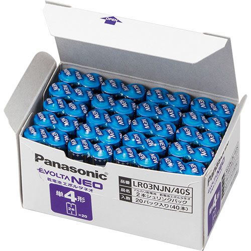●シュリンクタイプのアルカリ単4形乾電池40本パックです。●チタンパワーの採用で正極の反応効率がアップし、優れた保存性能を実現。防災用のストックにも、おすすめ。長期保存ができるので防災用にストックして置けばいざという時にパワーを発揮。もしもの時に備えて、安心して保存ができます。●銀の力でガスを削減する「液漏れを防止製法Ag+」採用。●使用性の視点から、極性を識別しやすくするためプラス極側ラベルの全周に「+」マークを表示。安全性の向上とともに乾電池エボルタNEOのデザイン的な特長にもなっています。さらに、プラス極側・マイナス極側には識別しやすいように青色と水色、2つの違う色を採用。パナソニックが独自に安全性を追求した「逆接防止に配慮したユニバーサルデザイン」です。●新しい電池と使用済の電池の混用は液漏れを引き起こす原因に。見分けるパックは1本ずつ切り離せるシュリンクフィルムとなっているため、新しい電池を一目で見分けることができ、新旧の混用を防ぎます。