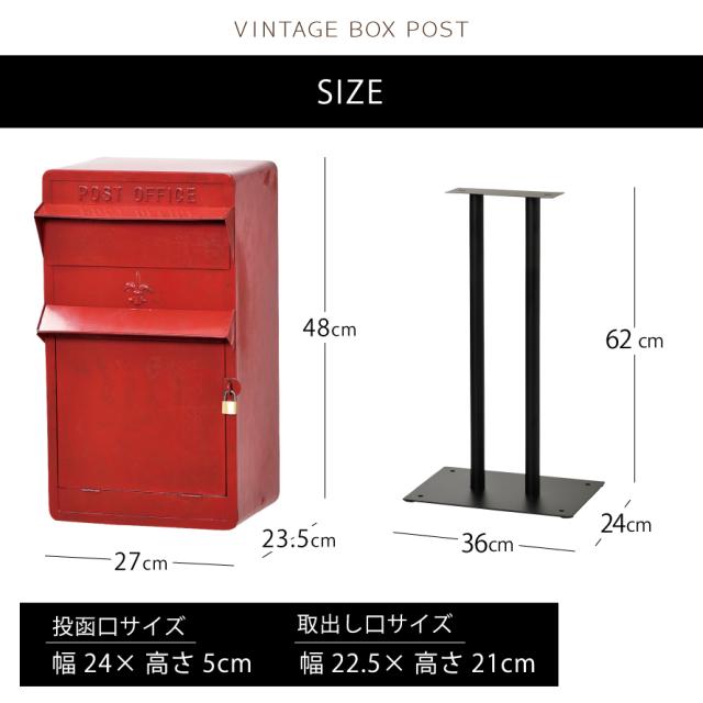 ■サイズ:幅27×奥行23.5×高さ48(投函口幅24×高さ5、取り出し口幅22.5×高さ21cm)、ポスト用スタンド/幅36×奥行24×高さ62cm