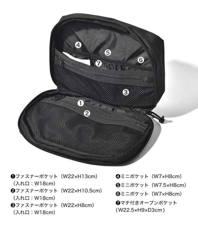 衝撃による内容物の破損や変形を防ぐため、両面に厚めのクッションを内蔵しているコスメティックポーチ。化粧品の収納だけでなく、多用途に使用できる汎用性の あるアイテムです。内側には小物の収納や整理に適した メッシュポケットをメインに、ジップポケットやスリップポケット など計7ヶのポケットを配備しました。 また、表面のジップポケットには起毛素材のライナーを 配備しているため、電子機器などの保護に適しています。