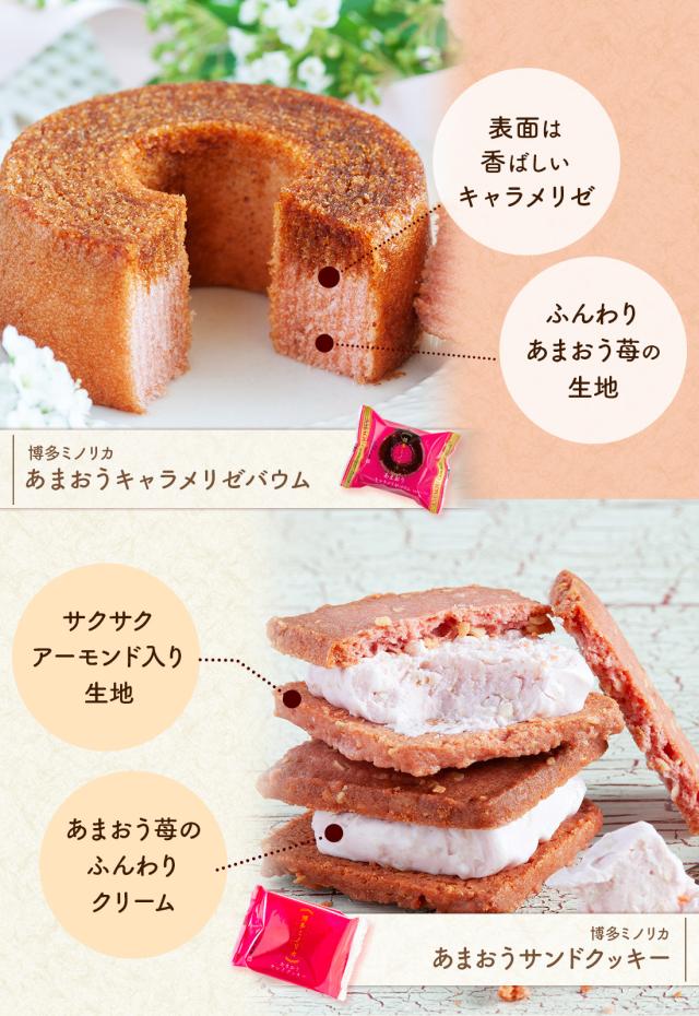 鶏卵(国産)、小麦粉、砂糖、植物油脂、水飴、コーンスターチ、いちご(博多あまおう)、ぶどう糖、カラメルシロップ/ソルビトール、膨張剤、乳化剤、香料、着色料(ラック、カロテン、紅麹)、酸化防止剤(V.E)、増粘多糖類、酸味料、pH調整剤、(一部に卵・小麦・大豆・りんごを含む)