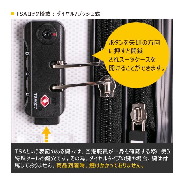 TSAロック |アメリカ(ハワイ等含む)渡航の際、TSA公認の製品に限り鍵をかけて預ける事ができます。この製品のTSAロックは米国連邦航空省運輸保安局が認定しTRAVELSENTRY社が管理・運営しているシステムです。